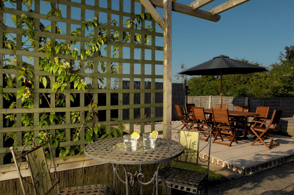 - Raised approx. 10cm, furnished with table, chairs, and umbrella