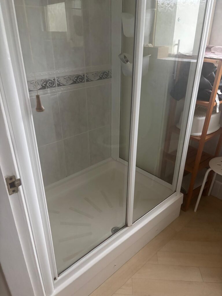 - Walk-in shower cubicle (step up approx. 15cm), handrail at entrance